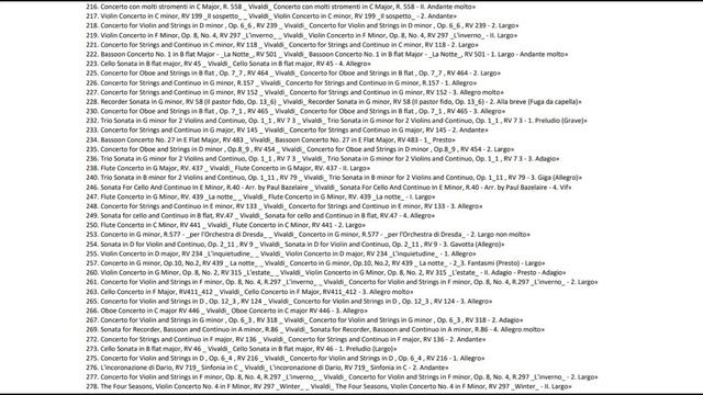 216. Concerto con molti stromenti in C Major, R. 558 _ Vivaldi_ Concerto con molti stromenti in C Major, R. 558 - II. Andante molto» 217. Violin Concerto in C minor, RV 199 _Il sospetto_ _ Vivaldi_ Violin Concerto in C minor, RV 199 _Il sospetto_ - 2. Andante» 218. Concerto for Violin and Strings in D minor , Op. 6_6 , RV 239 _ Vivaldi_ Concerto for Violin and Strings in D minor , Op. 6_6 , RV 239 - 2. Largo» 219. Violin Concerto in F Minor, Op. 8, No. 4, RV 297 _L'inverno_ _ Vivaldi_ Violin Concerto in F Minor, Op. 8, No. 4, RV 297 _L'inverno_ - II. Largo» 221. Concerto for Strings and Continuo in C minor, RV 118 _ Vivaldi_ Concerto for Strings and Continuo in C minor, RV 118 - 2. Largo» 222. Bassoon Concerto No. 1 in B flat Major - _La Notte_, RV 501 _ Vivaldi_ Bassoon Concerto No. 1 in B flat Major - _La Notte_, RV 501 - 1. Largo - Andante molto» 223. Cello Sonata in B flat major, RV 45 _ Vivaldi_ Cello Sonata in B flat major, RV 45 - 4. Allegro» 225. Concerto for Oboe and Strings in B flat , Op. 7_7 , RV 464 _ Vivaldi_ Concerto for Oboe and Strings in B flat , Op. 7_7 , RV 464 - 2. Largo» 226. Concerto for Strings and Continuo in G minor, R.157 _ Vivaldi_ Concerto for Strings and Continuo in G minor, R.157 - 1. Allegro» 227. Concerto for Strings and Continuo in G minor, RV 152 _ Vivaldi_ Concerto for Strings and Continuo in G minor, RV 152 - 3. Allegro molto» 228. Recorder Sonata in G minor, RV 58 (Il pastor fido, Op. 13_6) _ Vivaldi_ Recorder Sonata in G minor, RV 58 (Il pastor fido, Op. 13_6) - 2. Alla breve (Fuga da capella)» 230. Concerto for Oboe and Strings in B flat , Op. 7_1 , RV 465 _ Vivaldi_ Concerto for Oboe and Strings in B flat , Op. 7_1 , RV 465 - 3. Allegro» 232. Trio Sonata in G minor for 2 Violins and Continuo, Op. 1_1 , RV 7 3 _ Vivaldi_ Trio Sonata in G minor for 2 Violins and Continuo, Op. 1_1 , RV 7 3 - 1. Preludio (Grave)» 233. Concerto for Strings and Continuo in G major, RV 145 _ Vivaldi_ Concerto for Strings and Continuo in G major, RV 145 - 2. Andante» 234. Bassoon Concerto No. 27 in E Flat Major, RV 483 _ Vivaldi_ Bassoon Concerto No. 27 in E Flat Major, RV 483 - 1_ Presto» 235. Concerto for Oboe and Strings in D minor , Op.8_9 , RV 454 _ Vivaldi_ Concerto for Oboe and Strings in D minor , Op.8_9 , RV 454 - 2. Largo» 236. Trio Sonata in G minor for 2 Violins and Continuo, Op. 1_1 , RV 7 3 _ Vivaldi_ Trio Sonata in G minor for 2 Violins and Continuo, Op. 1_1 , RV 7 3 - 3. Adagio» 238. Flute Concerto in G Major, RV. 437 _ Vivaldi_ Flute Concerto in G Major, RV. 437 - II. Largo» 240. Trio Sonata in B minor for 2 Violins and Continuo, Op. 1_11 , RV 79 _ Vivaldi_ Trio Sonata in B minor for 2 Violins and Continuo, Op. 1_11 , RV 79 - 3. Giga (Allegro)» 246. Sonata For Cello And Continuo In E Minor, R.40 - Arr. by Paul Bazelaire _ Vivaldi_ Sonata For Cello And Continuo In E Minor, R.40 - Arr. by Paul Bazelaire - 4. Vif» 247. Flute Concerto in G Minor, RV. 439 _La notte_ _ Vivaldi_ Flute Concerto in G Minor, RV. 439 _La notte_ - I. Largo» 248. Concerto for Strings and Continuo in E minor, RV 133 _ Vivaldi_ Concerto for Strings and Continuo in E minor, RV 133 - 3. Allegro» 249. Sonata for cello and Continuo in B flat, RV.47 _ Vivaldi_ Sonata for cello and Continuo in B flat, RV.47 - 4. Allegro» 250. Flute Concerto in C Minor, RV 441 _ Vivaldi_ Flute Concerto in C Minor, RV 441 - 2. Largo» 253. Concerto in G minor, R.577 - _per l'Orchestra di Dresda_ _ Vivaldi_ Concerto in G minor, R.577 - _per l'Orchestra di Dresda_ - 2. Largo non molto» 254. Sonata in D for Violin and Continuo, Op. 2_11 , RV 9 _ Vivaldi_ Sonata in D for Violin and Continuo, Op. 2_11 , RV 9 - 3. Gavotta (Allegro)» 255. Violin Concerto in D major, RV 234 _L'inquietudine_ _ Vivaldi_ Violin Concerto in D major, RV 234 _L'inquietudine_ - 1. Allegro» 257. Concerto in G minor, Op.10, No.2, RV 439 _ La notte_ _ Vivaldi_ Concerto in G minor, Op.10, No.2, RV 439 _ La notte_ - 2_3. Fantasmi (Presto) - Largo» 260. Violin Concerto in G Minor, Op. 8, No. 2, RV 315 _L'estate_ _ Vivaldi_ Violin Concerto in G Minor, Op. 8, No. 2, RV 315 _L'estate_ - II. Adagio - Presto - Adagio» 261. Concerto for Violin and Strings in F minor, Op. 8, No. 4, R.297 _L'inverno_ _ Vivaldi_ Concerto for Violin and Strings in F minor, Op. 8, No. 4, R.297 _L'inverno_ - 2. Largo» 263. Cello Concerto in F Major, RV411_412 _ Vivaldi_ Cello Concerto in F Major, RV411_412 - 3. Allegro molto» 265. Concerto for Violin and Strings in D , Op. 12_3 , RV 124 _ Vivaldi_ Concerto for Violin and Strings in D , Op. 12_3 , RV 124 - 3. Allegro» 266. Oboe Concerto in C major RV 446 _ Vivaldi_ Oboe Concerto in C major RV 446 - 3. Allegro» 267. Concerto for Violin and Strings in G minor , Op. 6_3 , RV 318 _ Vivaldi_ Concerto for Violin and Strings in G minor , Op. 6_3 , RV 318 - 2. Adagio» 269. Sonata for Recorder, Bassoon and Continuo in A minor, R.86 _ Vivaldi_ Sonata for Recorder, Bassoon and Continuo in A minor, R.86 - 4. Allegro molto» 2