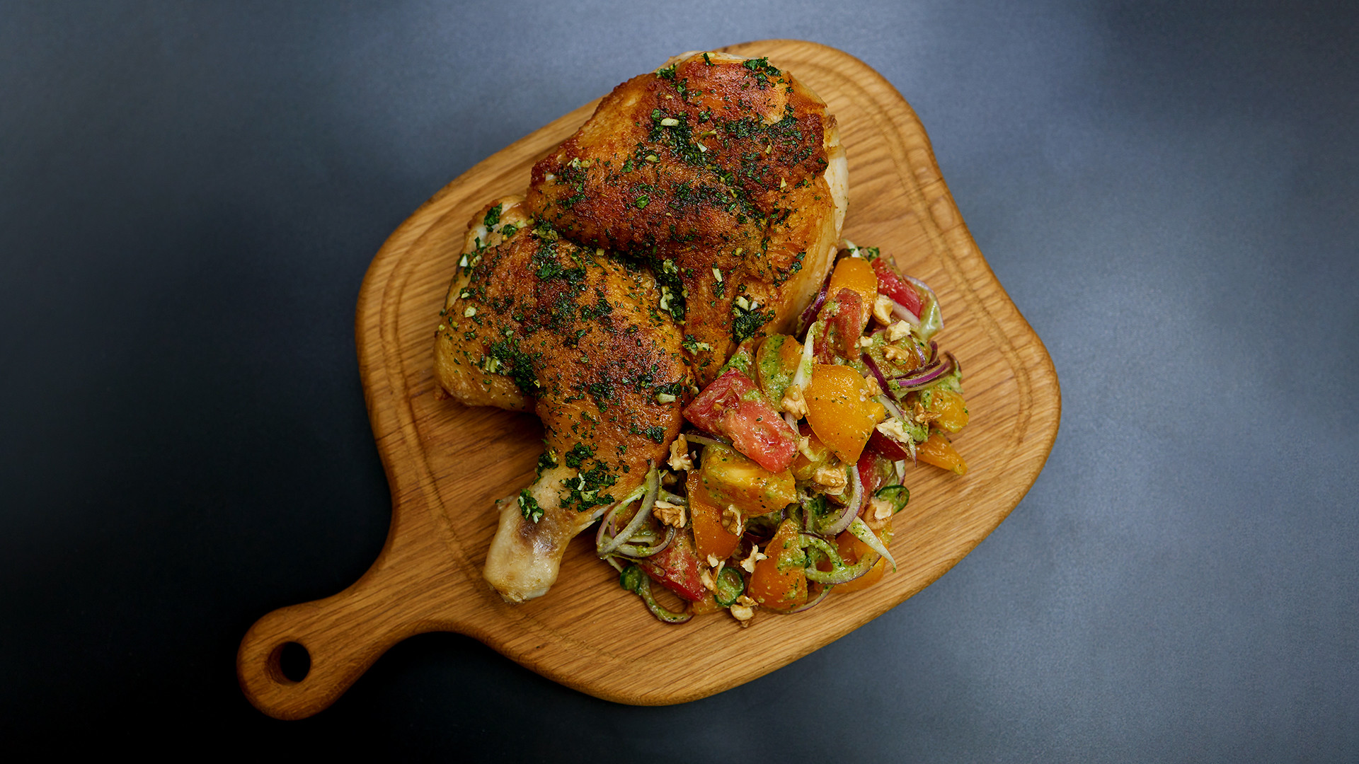Цыпленок тапака с салатом из медовых помидоров и соусом из кинзы