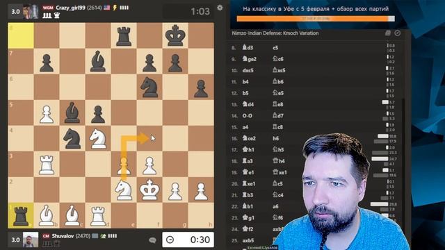 Донат https://donatepay.ru/don/Shuvalov - на участие в турнире по классике с 5 февраля в Уфе Резервный донат https://www.donationalerts.com/r/shuvalov_evgenij Турнир https://www.chess.com/play/tournament/4532494?ref_id=26382922 Играю в сильнейшем онлайн-турнире с титулованными шахматистами. По окончании турнира - игра с Заядлыми игроками! Чтобы стать Заядлым игроком, нужно оформить спонсорскую подписку здесь https://boosty.to/shuvalov_chess Вызовы принимаются на логин https://www.chess.com/member/shuvalov?ref_id=26382922 Ответы на часто задаваемые вопросы https://dzen.ru/a/ZYqA4qSvuEWxqzOA?share_to=link Какой программой я пользуюсь для анализа? - ChessBase! Последнюю версию можно найти тут https://www.chessbase.ru/?check=8 Вступай в мой клуб Пожиратели шахмат на чесс ком https://www.chess.com/club/pozhirateli-shakhmat?ref_id=26382922 Канал на Дзен https://dzen.ru/shuvalov_chess