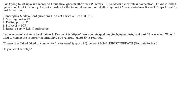 Unix & Linux: Virtualbox ssh (Connection Failed EHOSTUNREACH)