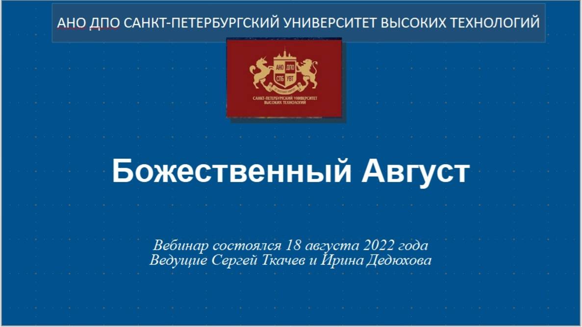 Божественный Август (2022) Четвертый вебинар Книжной лавки на эту тему состоялся 18.08.2022 г. Ведущие Сергей Ткачев и Ирина Дедюхова. Читать по теме: Божественный Август https://ogurcova-portal.com/bozhestvennyiy-avgust/ (2018/2020/2021/2022/2023/2024) Первый вебинар 2018 года - https://home.strannik-j.org/video/58ba2eb95a44aab200c0887fcd3150f6/ Второй вебинар 2020 года - https://home.strannik-j.org/video/64ee02b71e87e2bef1a1d8593c4ece3b/ Третий вебинар 2021 года - https://home.strannik-j.org/video/768d2634427ce11c26b25287c97adad0/ Источники: Научно-технический портал «Технарь» https://ogurcova-online.com/ "Книжная лавка" https://ogurcova-portal.com/ "Литературное обозрение" https://litobozrenie.com/ Вебинар разработан и проведен в рамках образовательных программ АНО ДПО СПБ УВТ - Санкт-Петербургский университет высоких технологий https://univer.spb.ru/ в соответствии с законодательством об образовательной деятельности в РФ N 273-ФЗ по лицензии №3911 Комитета по образованию Правительства СПб https://univer.spb.ru/wp-content/uploads/2019/12/license015small-1.jpg