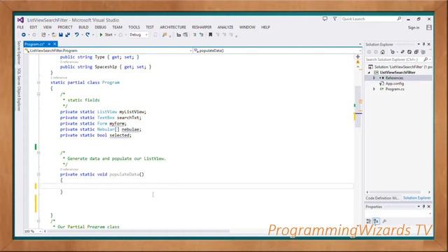 C# ListView Search/Filter Tutorial and Example. We see how to perform a multi-parameter search filter. We work with a multi-column ListView. The user searches/filters by typing on a TextBox. Here's the Source Code : http://camposha.info/winforms/listview-search-filter Let's go. What's up guys, how do you do? Welcome to todays edition of ProgrammingWizards TV. In this class we will see how to search or filter a multi-column listview. The user types data in the Search box or textbox in this case. Then we filter based on that query. If we click the searched item we can show it in a messagebox. We are filtering based on multiple parameters or columns, not just one. Our ListView has three columns and users can search/filter based on any of those. You can see the clicked items being shown in our message box. We are taking all the columns into consideration while searching our data. We will create our project from scratch as opposed to using the designer. Our C# search/filter tutorial and example right here guys. Say I want to filter all the reflection nebulas in our listView. We just type it there and we can then easily filter. What about if we want to search the Bumerang nebular. Well we just start typing and the data easily gets filtered. Let's start with our C# windows forms listview tutorial guys. Am using Visual Studio 2013 IDE. First we need to create an empty project in the IDE. We will choose Console application, C# even though we will create a windows form application. This is because we want to start from scratch so as to learn more details instead of just using the designer. So first we go ahead and add System.Windows.Forms and System.Drawing references to our project. Once the dialog is shown, you just] search them in the search box. Then tick them and click ok. Then we come create our namespace. We add three using statements, System, System.Drawing and System.Windows.Forms namespaces. Then we come create our Plain Old CLR Object(POCO) class. This class will represent a single Nebular object. We specify the auto-properties of our Nebular. The nebular will have a name, type and spaceship properties. Then we come create our main class. This class is a static class and will also contain static fields. These fields include our ListView, textBox, Form, an array to represent our data source and a boolean field to hold the selection state of our ListView. Then we'll come create another partial class within the same namespace. In this second partial class we will create and initialize our components. First we start by a method called createComponents() that will do exactly that. First we instantiate a windows form label, Using Object initializer syntax, we set its Location, Size, Font and text properties. Then we come create a TextBox. This TextBox will act as our search box. Users will type the query in this TextBox. We pass it the Location, Size and TabIndex properties. Then we come create our ListView, instantiating. We also set its properties . Take note we assign it the `View.Details` property as ListView normally has several types of views. We also assign it FullRowSelect, setting it true so that when user clicks a ListView item, we select the whole row. Then we add the columns to our ListView. The ListView will have three columns as you can see. Then we add the search textbox, the search label and the ListView in our Form's Controls property. We then come back to our main class. First we create a method to populate our data source. We instantiate an array of objects. Then instantiate the individual Nebular objects, passing the their properties data. We add as many data as we want in our Array. These data will get rendered in our C# ListView. Then we come create a for-each loop. We are looping through our data source. First we invoke the Add() method to add our data to ListView. We instantiate a ListViewItem, passing in array containing our records and passing it to our Add() method. Let's go.