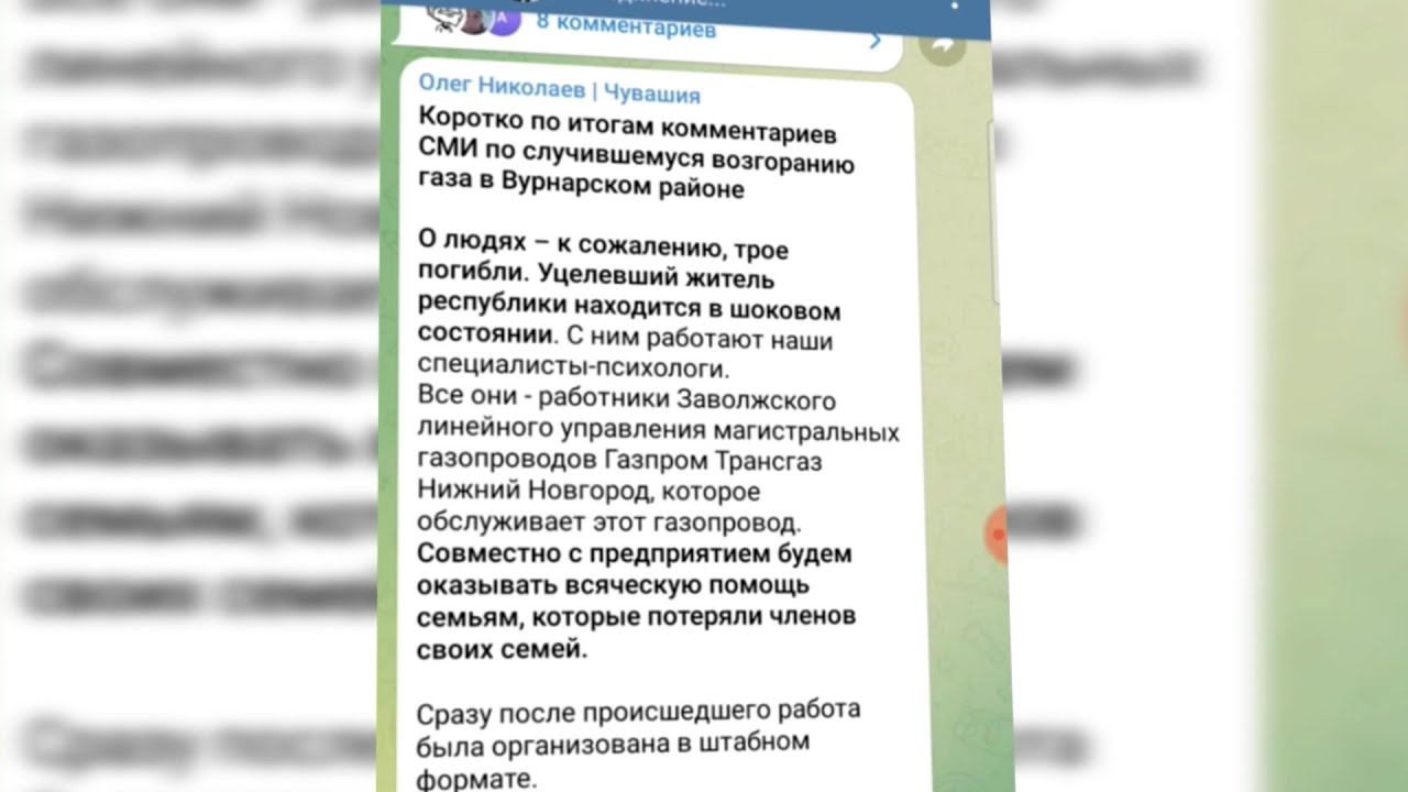 Олег Николаев в своем телеграм-канале прокомментировал возгорание газа в Вурнарском районе. «Глава Чувашии сообщил, что выживший житель республики находится в шоковом состоянии, с ним работают специалисты-психологи. Трое погибли – все они работники Заволжского линейного управления магистральных газопроводов Газпром Трансгаз Нижний Новгород, которое обслуживает этот участок. Совместно с предприятием будем оказывать всяческую помощь семьям». Сразу после происшествия в республике начал работать штаб по ликвидации чрезвычайной ситуации. Оперативные службы выехали на место, чтобы обеспечить локализацию пожара, не допустить перехода огня на жилые дома, эти задачи были первостепенными. Сейчас на месте возгорания работают оперативные службы. «Это магистральный газопровод. От него не запитывается территория Чувашской Республики, это транзитный газ, который обеспечивает перекачку топлива в европейские страны», – сообщил Глава региона.