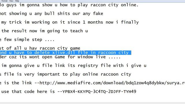 hello guys im gonna show u how to play raccon city online. im not showing u any bull shits our any fake its my trick im working on it since 1 months now i finally got the result now im going to teach u some few simple step .... first of all u hav raccon city game second u have to delete xlive.dll file in raccoon city folder coz its wont open Game for window live ..... now im gonna give u file link its registry file with i give u this file is very important to play online raccoon city here is the link --http://www.mediafire.com/download/bdq1zow4q8dybkw/surya.reg and use that code here is --YPBX4-KKYPQ-3C4TQ-2DJFF-TYH49 ADD me IN GFWL --- FightingSurya Plz guys like and subscribe and share for more and enjoy dis trick...happy gaming :)