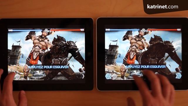 Quelques petits tests de différences de performances entre un iPad 2 et un iPad première génération. Le plus flagrant pour le moment est sur la gestion du multitâche qui améliore véritablement l'expérience utilisateur de la tablette avec beaucoup moins de latence en passant d'une appli à une autre. On note aussi une plus grande fluidité pour l'iPad 2 sur les jeux avec ici Infinity Blade (moins visible sur la vidéo). Mais ce sont les applications et jeux à venir qui marqueront encore mieux cette différence.