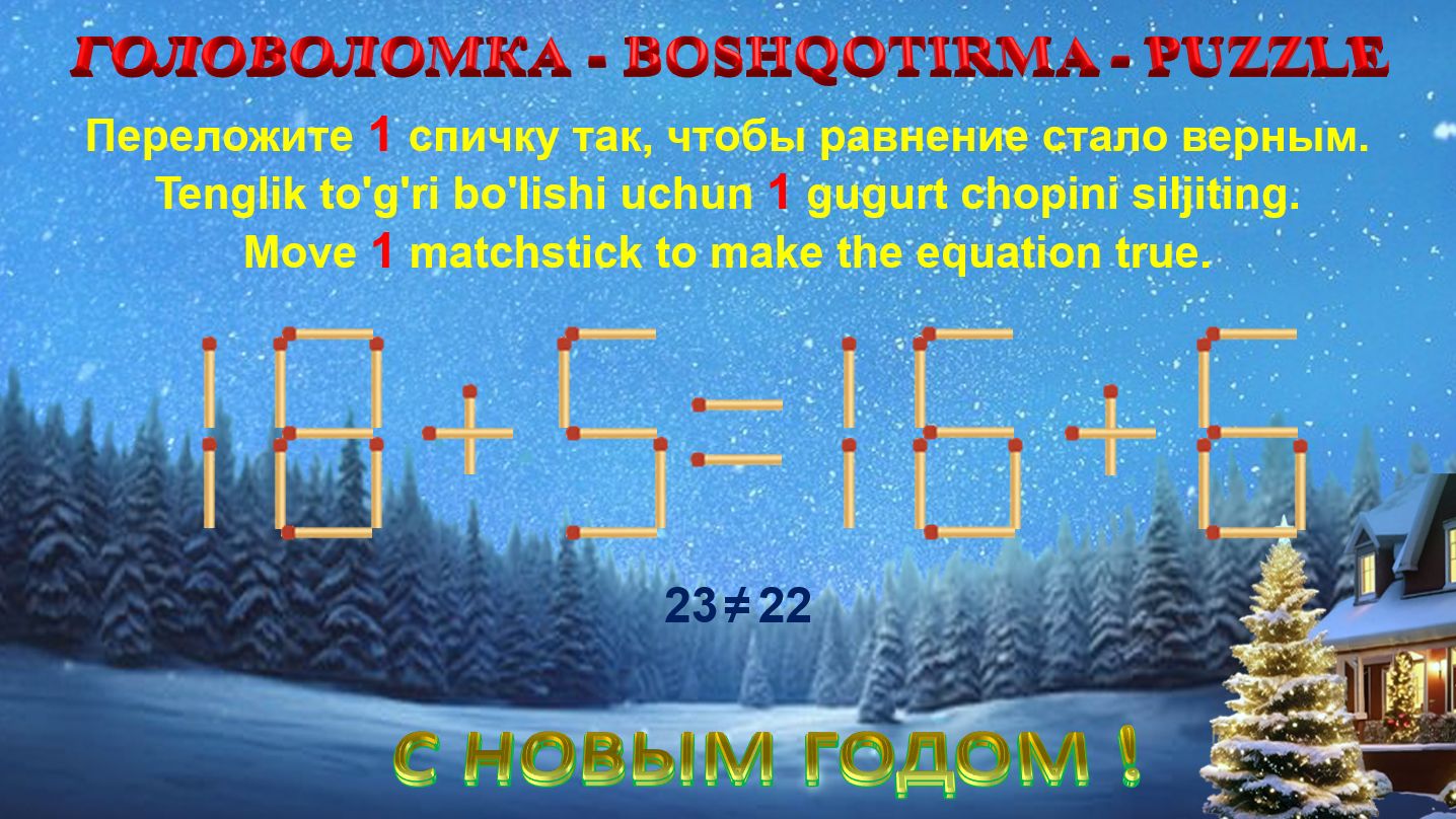 ГОЛОВОЛОМКА - BOSHQOTIRMA – PUZZLE. Спичка. 18+5=16+6, 10+9=13+9, 14+6=13+5, 13+5=16+4