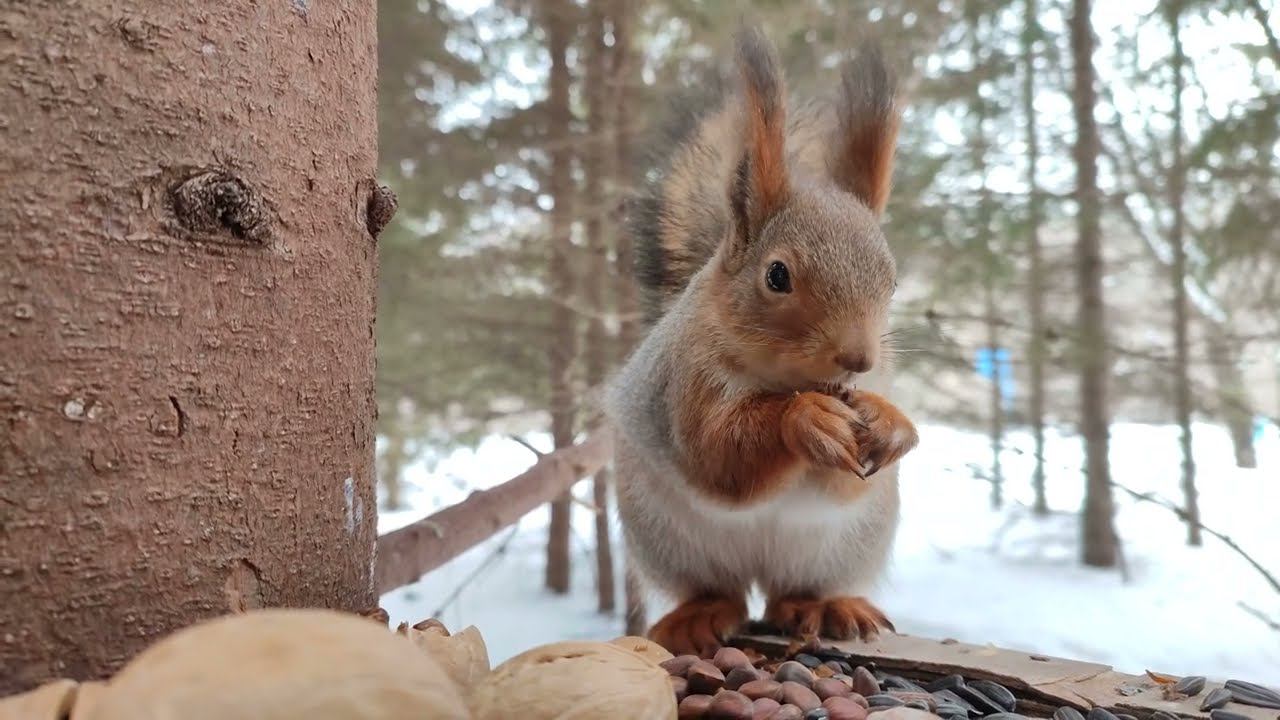 Рыженькая белка ест кедряшки и грецкие орехи