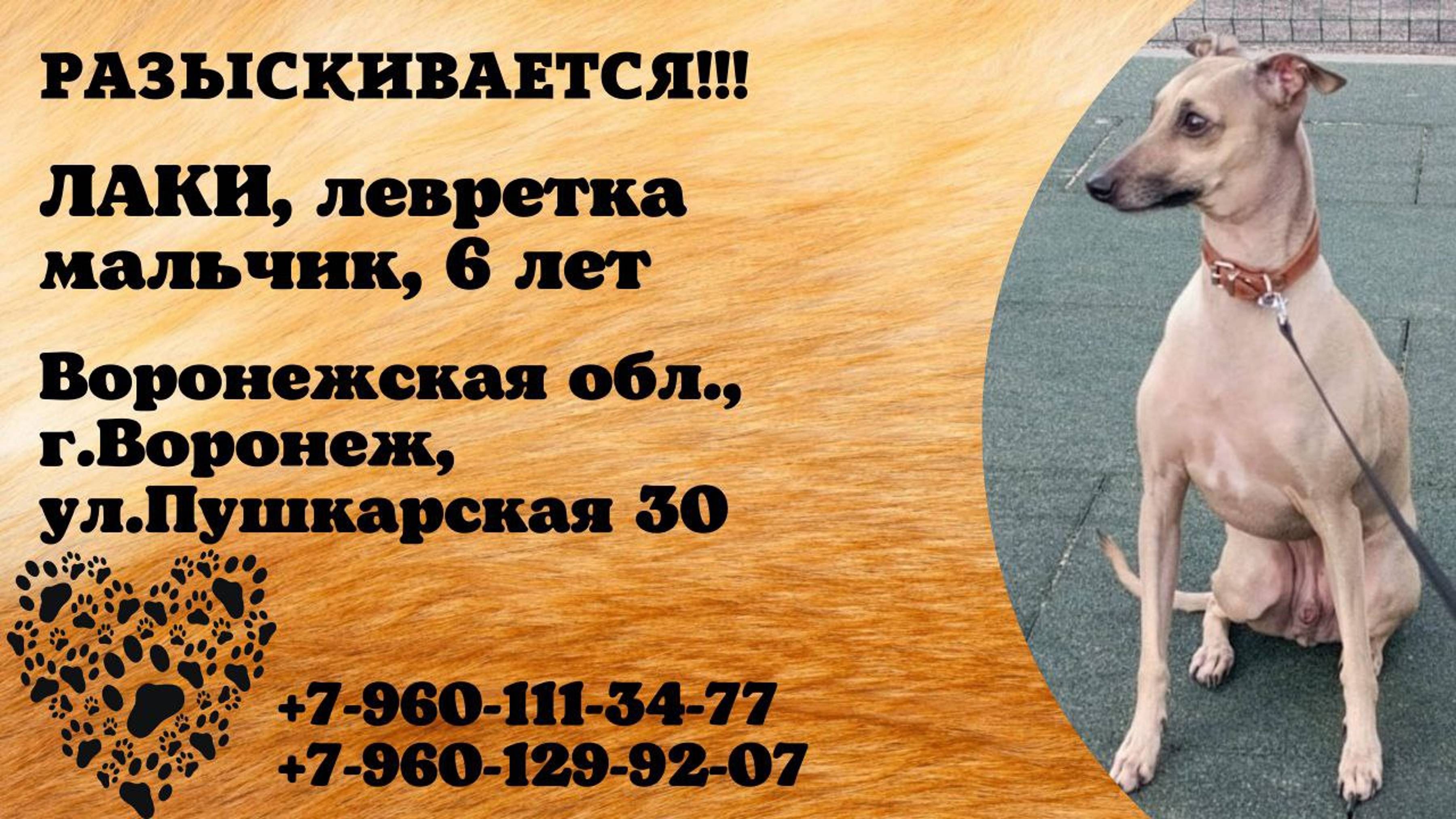 Пропала собака! ЛАКИ, левретка мальчик. 6 лет. Воронежская обл, г. Воронеж