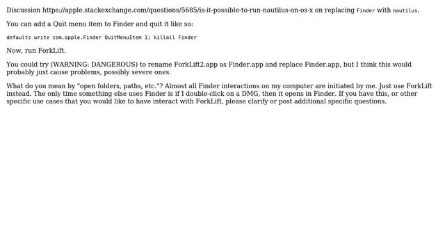 Apple: Replace Finder with Forklift Helpful? Please support me on Patreon: https://www.patreon.com/roelvandepaar With thanks & praise to God, and with thanks to the many people who have made this project possible! | Content (except music & images) licensed under CC BY-SA https://meta.stackexchange.com/help/licensing | Music: https://www.bensound.com/licensing | Images: https://stocksnap.io/license & others | With thanks to user Marc (apple.stackexchange.com/users/3391), user diimdeep (apple.stackexchange.com/users/7049), user BB9z (apple.stackexchange.com/users/65417), and the Stack Exchange Network (apple.stackexchange.com/questions/7863). Trademarks are property of their respective owners. Disclaimer: All information is provided "AS IS" without warranty of any kind. You are responsible for your own actions. Please contact me if anything is amiss at Roel D.OT VandePaar A.T gmail.com