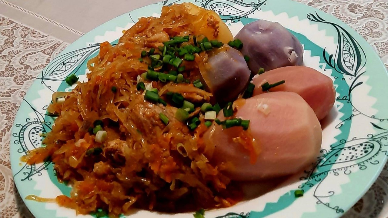 У вас ещё осталась квашеная капуста?! Тогда приготовьте её по этому рецепту и точно не пожалейте!! Вкус и аромат просто не передать словами, а готовится , как всегда, очень просто и из доступных продуктов!! РЕЦЕПТ: - 1 кг свиной грудинки - 3-х литровая , не много не полная, банка квашеной капусты - 2 средних луковицы - 1 большая морковь - 0,5 ч л молотого кориандра - 2 ч л паприки - 3 лавровых листа - соль, перец по вкусу Подавать буду с отварным картофелем!! ***************************************************************** ВСЕМ ПРИЯТНОГО АППЕТИТА!! От Татьяны с любовью 💞💞💞
