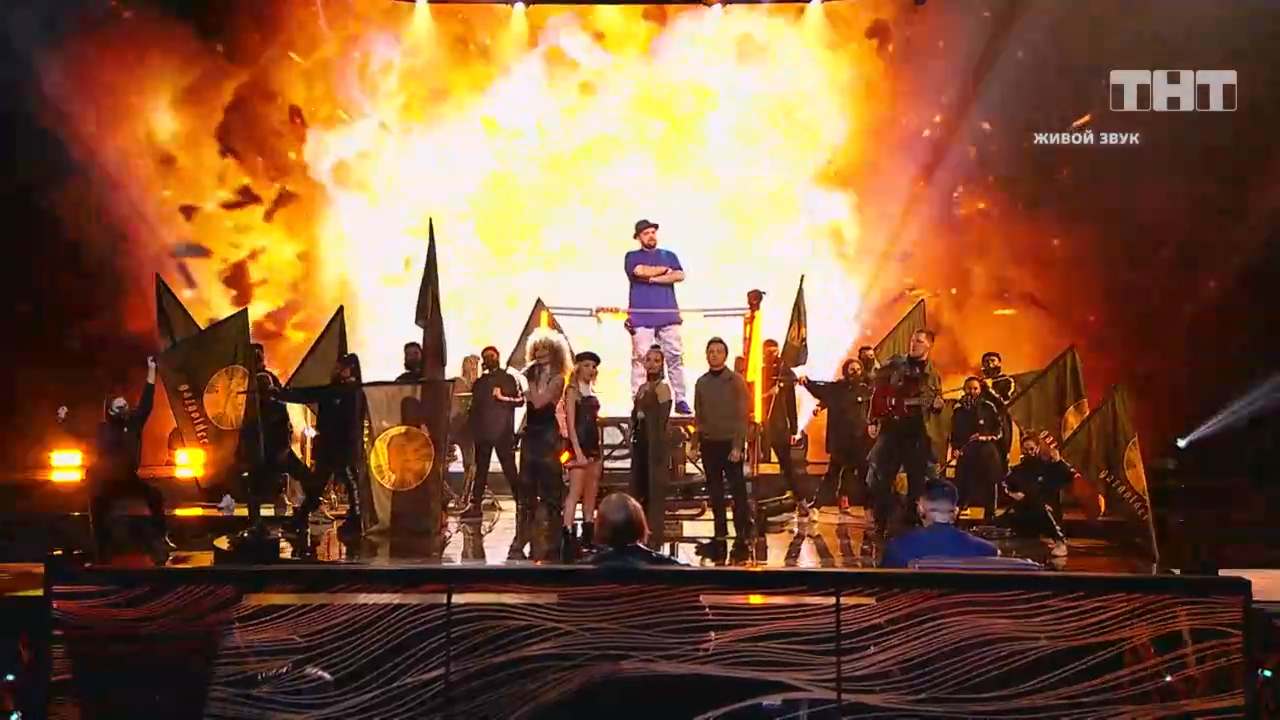 Команда Gazgolder спела хвалебную песню. Ребята уверяют со сцены шоу #ПЕСНИ, что они лучшие. Самые оригинальные и талантливые. В конце исполнения Баста встал со своего места и на фоне герба творческого объедения подтвердил своё лидерство в музыкальном мире.