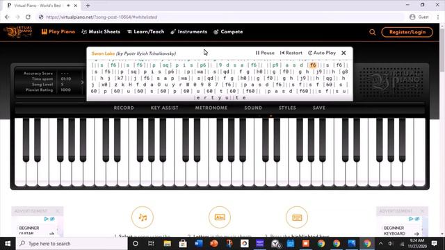 Swan Lake - Pyotr Ilyich Tchaikovsky, by A. Srambical Music Sheet: [f6]| |[p9] a s d [f6]||s [f6]||s [f6]||p [sq] p i s [p6]| |9 d s a [f6]| |[p9] a s d [f6]||s [f6]||s [f6]||p [sq] p i s [p6]| |p| [wa]| s| [qd]| f g [h0]||g [f0]| g h [j9]||h [g8]| h j [k7]||j [f6] s a p [wa]| s| [qd]| f g [h0]||g [f0]| g h [j9]||h [qg]| h j [^J]||g [d^]| g J [k7]||G [k0]||f [f6]| |[p9] a s d [f6]||s [f6]||s [f6]||p [sq] p i s [p6]| |9 d s a [f6]| |[p9] a s d [f6]||s [f6]||s [f6]||p [sq] p i s [p6]| |p| [wa]| s| [qd]| f g [h0]||g [f0]| g h [j9]||h [g8]| h j [k7]||j [f6] s a p [wa]| s| [qd]| f g [h0]||g [f0]| g h [j9]||h [qg]| h j [x0] z k H f d a O u y r W 0 9 8 7 [f6]| |p a s d [f6]||s f||s f [60] s [60] p [60] u [60] s [60] p [60] u [60] t [60] [f60]| |p a s d [f60]||s f||s u| |e r t y u||t e Play this at: https://virtualpiano.net/
