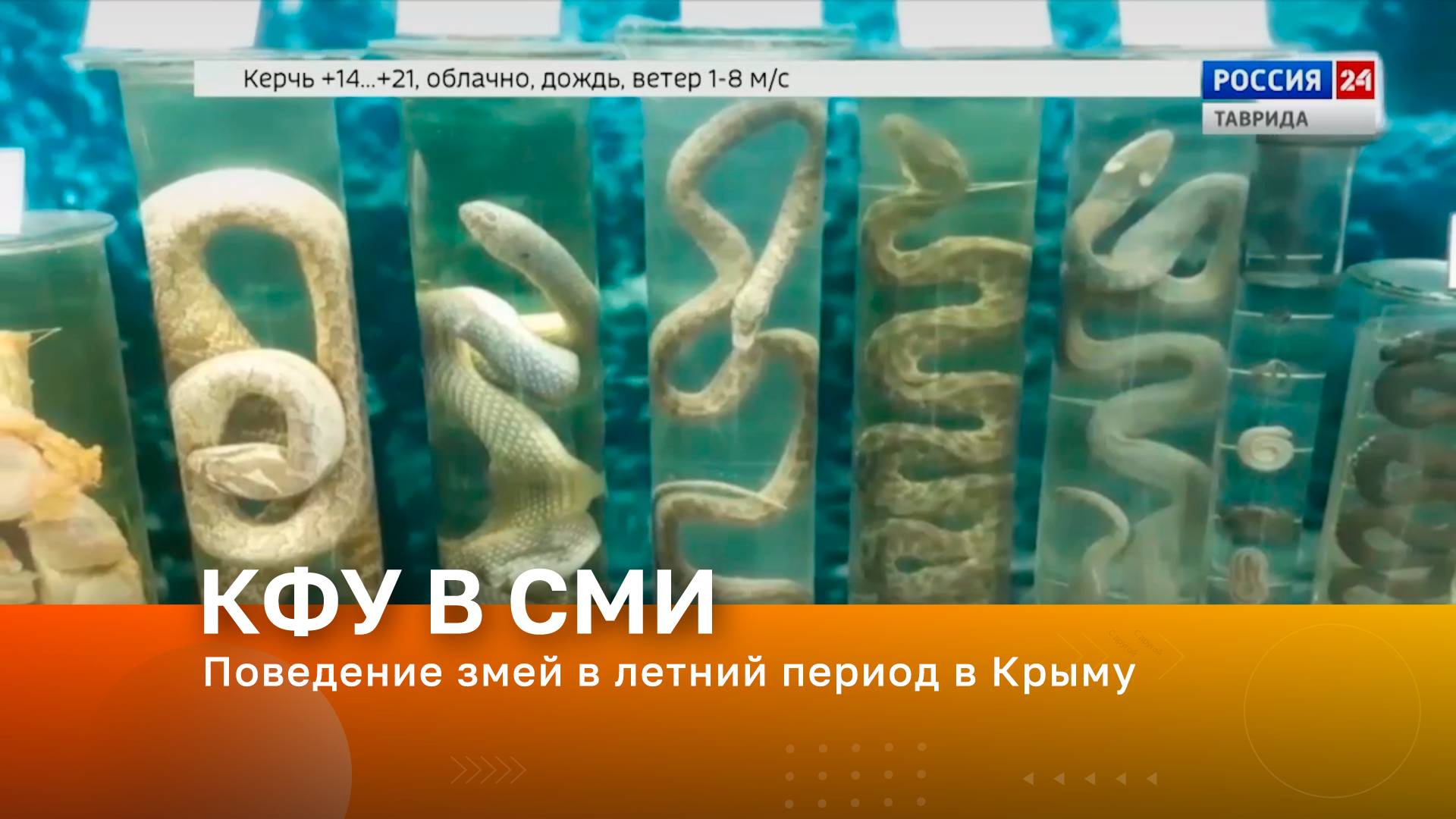 Телеканал «Россия 1. Таврида». В эфире – доцент кафедры зоологии и аквакультуры КФУ им. В.И. Вернадского Сергей Леонов Тема эфира – Поведение змей в летний период в Крыму.
