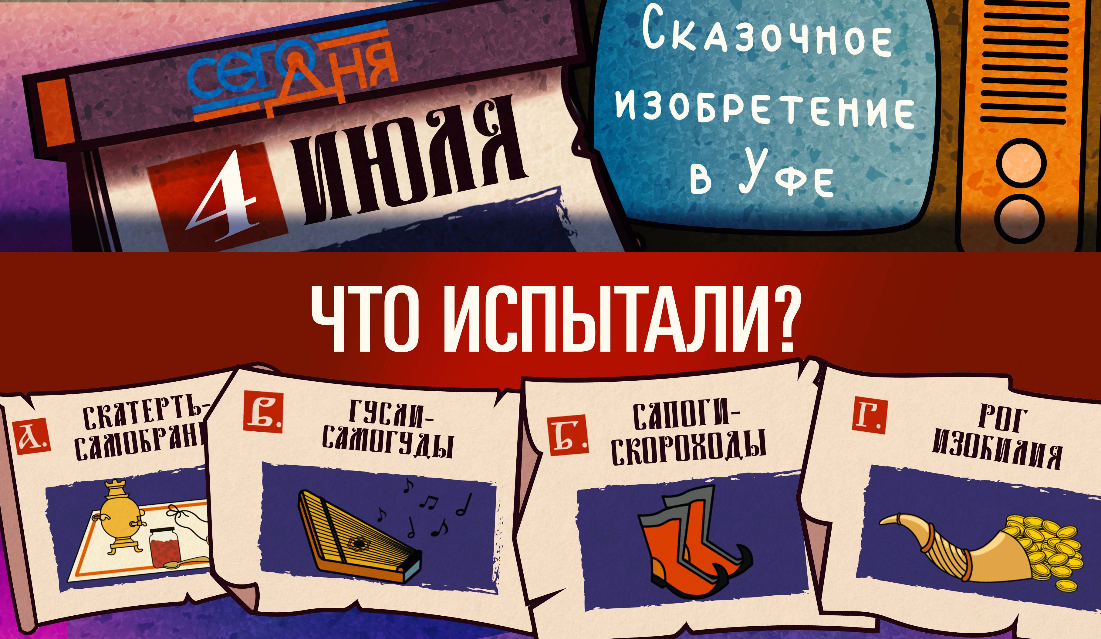Сегодня день отдыха от праздников. Знаем, мы все хотели такой день! Какое же испытали изобретение, созданное по мотивам сказки? Отгадай, что случилось «Сего дня»!