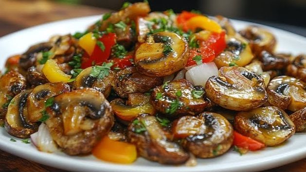 Ингредиенты: грибы (шампиньоны или другие свежие) — 300 г; лук репчатый — 1 шт. (среднего размера); чеснок — 3 зубчика; лук‑порей — 1 небольшой стебель; болгарский перец — 1 шт.; оливковое масло — 2–3 ст. л.; соевый соус — 2 ст. л.; мука — 1 ч. л. (для лёгкой панировки, по желанию); петрушка свежая — небольшой пучок; семена кунжута — 1 ст. л. (для подачи); соль — по вкусу; вода — 50–100 мл (при необходимости). Пошаговый рецепт: Подготовка ингредиентов: Грибы промойте, обсушите и нарежьте пластинками (если крупные). Лук и лук‑порей нарежьте полукольцами. Болгарский перец очистите от семян и нарежьте полосками. Чеснок мелко порубите или пропустите через пресс. Петрушку мелко нарежьте. Обжарка грибов: Разогрейте сковороду, добавьте оливковое масло. Выложите грибы в один слой и жарьте на сильном огне 3–4 минуты до золотистой корочки (не перемешивайте сразу, чтобы добиться карамелизации). Переверните грибы и жарьте ещё 2–3 минуты. При желании слегка присыпьте мукой и перемешайте (это добавит хрусткости). Добавление овощей: Добавьте лук и лук‑порей, жарьте 2–3 минуты до мягкости лука. Введите болгарский перец, перемешайте и готовьте ещё 2 минуты. Финальная заправка: Уменьшите огонь до среднего. Добавьте чеснок и жарьте 1 минуту (не пережарьте, чтобы не горчил). Влейте соевый соус, перемешайте. При необходимости добавьте немного воды (50–100 мл), чтобы соус слегка загустел. Посолите по вкусу (учитывайте солёность соевого соуса). Посыпьте петрушкой, перемешайте и снимите с огня. Подача: Разложите грибы по тарелкам. Посыпьте семенами кунжута. Украсьте веточками петрушки. Советы: Выбор грибов: лучше всего подойдут шампиньоны, вешенки или смесь лесных грибов. Интенсивная карамелизация: не перемешивайте грибы сразу — дайте им подрумяниться. Соевый соус: выбирайте качественный, без избытка консервантов. Острота: добавьте щепотку красного перца или чили для пикантности. Веганский вариант: замените сливочное масло на растительное. Варианты подачи: С рисом: подайте с отварным рисом (150 г на порцию). На тостах: выложите грибы на поджаренные ломтики хлеба. В пасте: добавьте к отварным макарам или лапше. Как гарнир: дополните салат из свежих овощей или зелень. Для праздничного стола: оформите порционно в маленьких сковородках или керамических формах. Приятного аппетита!