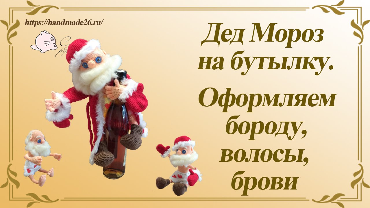 Полным ходом идет подготовка к Новому году. И в этом году я наконец-то осуществила свою давнюю мечту связать Деда мороза на бутылку. Всегда очень хотела связать не просто чехол на бутылку, а какой-нибудь интересный персонаж. Дед Мороз получился универсальный. Из-за каркаса этот Дед Мороз подходит на бутылку любого размера. Так же его можно просто посадить под елку и дать в руки подарок. Мастер класс по вязанию Деда Мороза в формате PDF можно найти в интернет магазине "Сделано руками" https://handmade26.ru/product/master-klass-po-vyazaniyu-ded-moroz-na-butylku_2402.html Мастер класс содержит 32 страницы текстового описания, 160 подробных фото процесса. Сняла несколько видео по оформлению лица Деда Мороза. В этом видео покажу как приваливала волосы, бороду, брови. Мои мастер классы можно найти тут: https://handmade26.ru/catalog/vyazanie/master-klassy/ Мои работы тут: https://handmade26.ru/