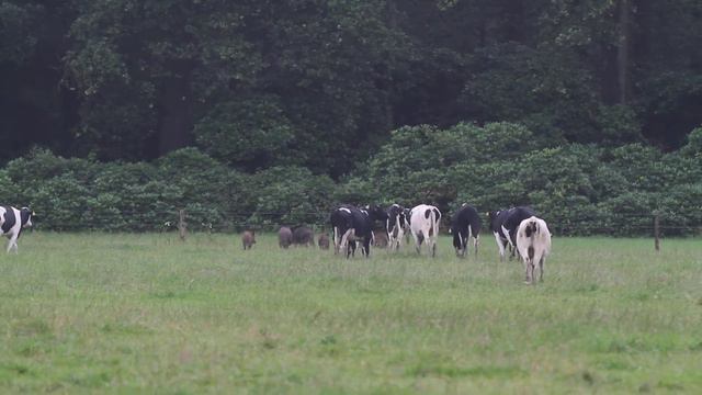 De koeien drijven de wilde zwijnen uit het weiland