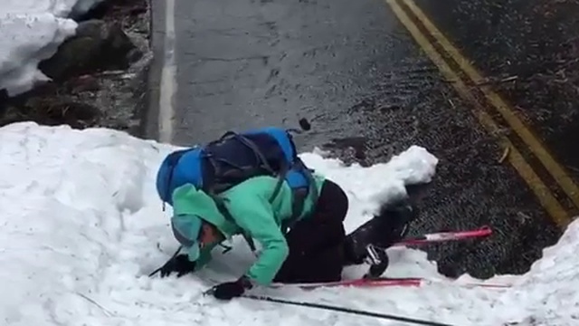 Девушка на лыжах не может забраться на небольшой сугроб. #девушки #падения #снег #прикол