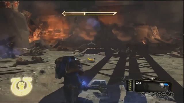Inquisitor Drogan's wound slows down the Space Marines as they battle Orks. For more on this game, visit: http://www.gamespot.com/pc/action/warhammer-40000-space-marine/index.html