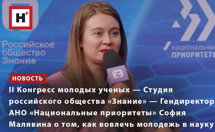 Во второй день работы II Конгресса молодых ученых в прямом эфире студии российского общества «Знание» директор АНО «Национальные приоритеты» София Малявина рассказала, как привлечь молодежь в науку, какие программы для этого реализовываются и насколько успешна работа по популяризации науки в стране