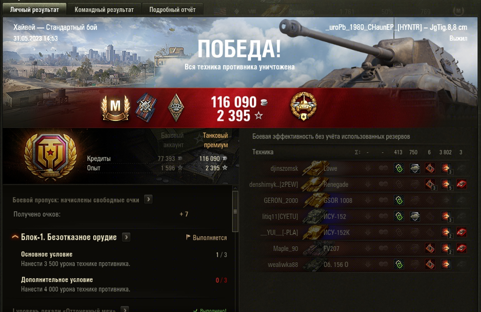 ХАЙВЕЙ МАСТЕР на JgTig.8,8 cm ОПЫТ: 1451 СУММАРНЫЙ УРОН: 4215 медаль ОСНОВНОЙ КАЛИБР