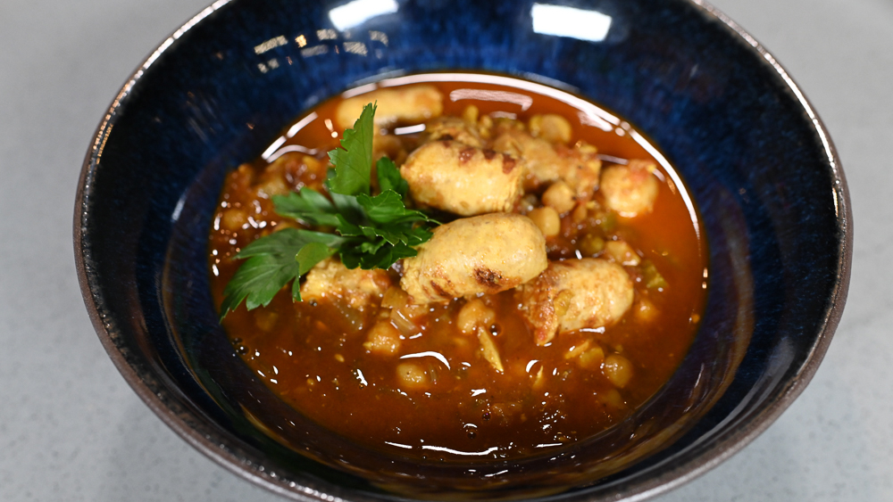 Марокканский суп с нутом и куриными колбасками гриль. Бабагануш с питой