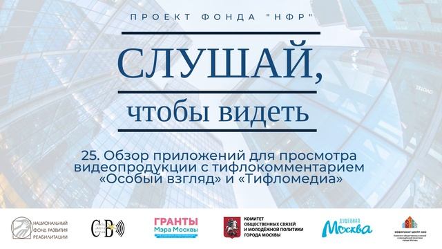 Вашему вниманию предлагается 25-й подкаст проекта «Слушай, чтобы видеть», который создан для незрячих пользователей электронных сервисов. Выпуск посвящен обзору приложений для просмотра видеопродукции с тифлокомментарием «Особый взгляд» и «Тифломедиа». Василий Дрожжин и Всеволод Попов описывают основной функционал и демонстрируют работу сервиса на примере приложений для пользователей устройств на платформе iOS. Информационно-просветительские подкасты рассчитаны на аудиторию незрячих пользователей электронной техники. Проект реализует «Национальный фонд развития реабилитации», при поддержке Комитета общественных связей и молодежной политики города Москвы. Ссылка на приложение «Особый взгляд» в магазине App Store: https://apps.apple.com/ru/app/особый-взгляд/id6443960394 Ссылка на официальный сайт проекта «Тифломедиа»: https://tiflomedia.com/