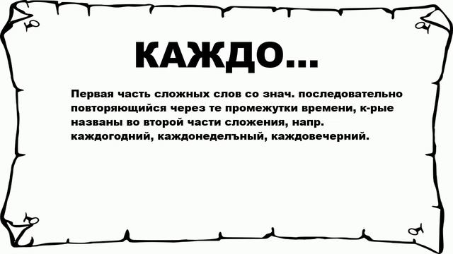 Хочешь знать что значит КАЖДО...? тогда слушай до конца. Первая часть сложных слов со знач. последовательно повторяющийся через те промежутки времени, к-рые названы во второй части сложения, напр. каждогодний, каждонеделъный, каждовечерний. Больше слов: #слова #словарьрусский #значениеслов