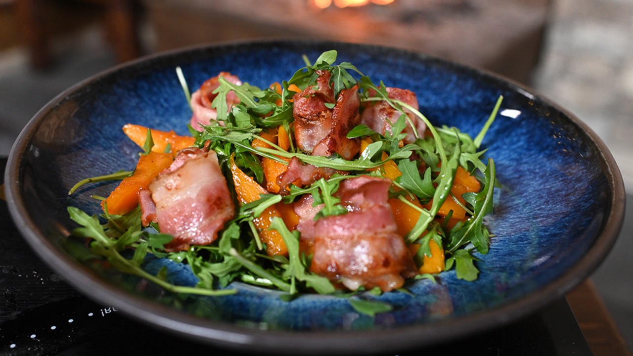 Рагу из бычьих хвостов. Салат из тыквы, рукколы, жареного бекона с ванильно-перечным соусом