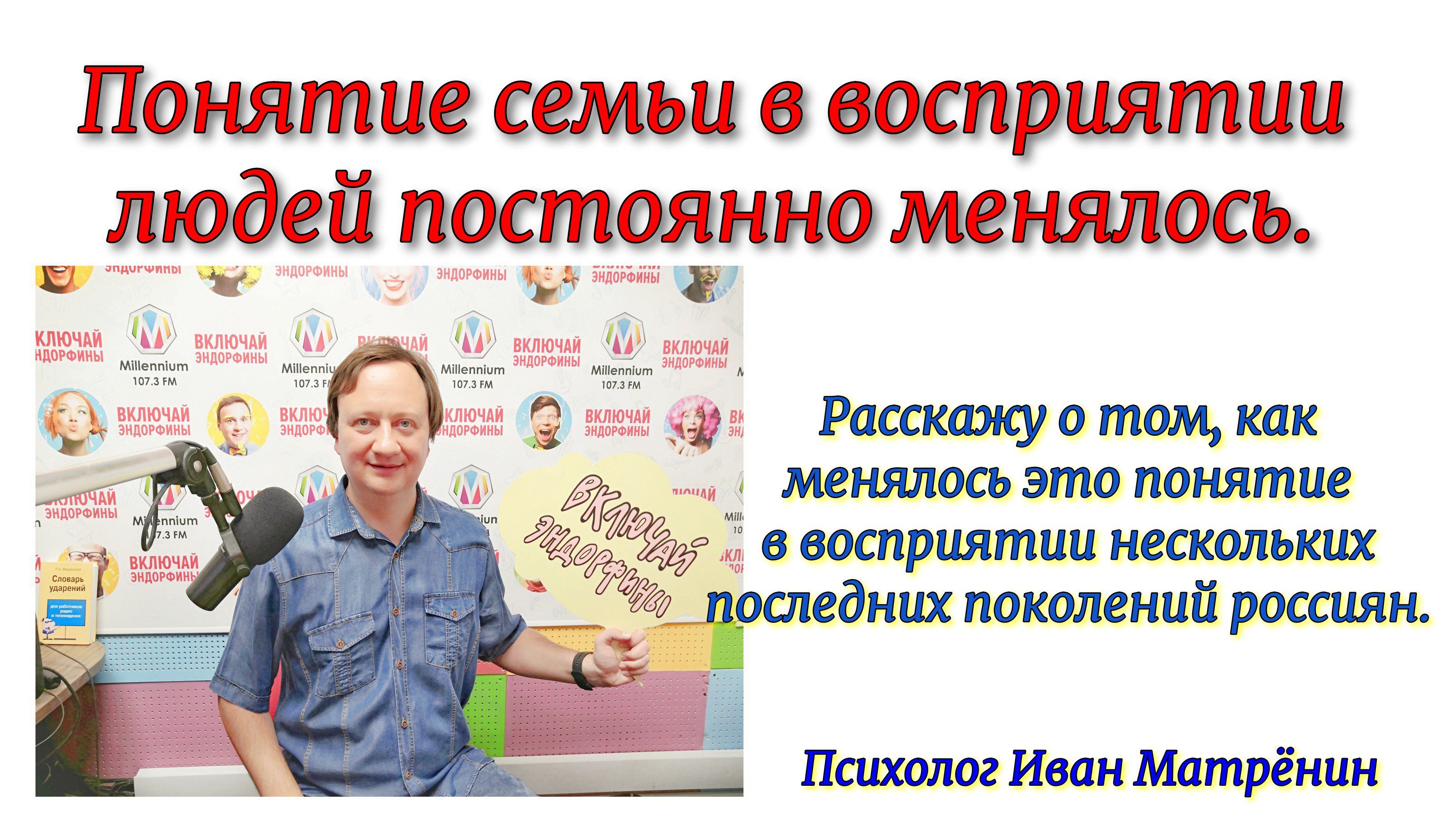Это видео - фрагмент моего эфира на радио. Меня попросили разъяснить понятие семьи. Я рассказал о том, что это понятие в восприятии людей постоянно менялось и отдельно рассказал о том, как менялось это понятие в восприятии нескольких последних поколений россиян. Когда-то в семье всё было просто, мужчина глава, женщине слова не давалось, а семья создавалась ради рождения детей. Сейчас в семье может и детей не быть, и женщина может быть главой семьи. Подробнее, в этом видео. Приятного просмотра! Мой канал в яндекс.дзен - https://zen.yandex.ru/id/5f70d4869a7ae678ed1e96ea. Здесь много текстов и видео на эту и другие темы на стыке психологии и снижение веса. Ссылка на это видео в яндекс дзен – https://zen.yandex.ru/video/watch/619551b2f5580d6876a2a12f https://zen.yandex.ru/media/ivanmatrenin/tendenciia-v-sovremennyh-semiah-otkladyvat-rojdenie-detei-na-potom-na-polzu-li-eto-seme-i-dlia-kajdogo-v-nei-619551b2f5580d6876a2a12f * Мой канал в YouTube - http://www.youtube.com/c/ПсихологИванМатрёнин. Ссылка на это видео в YouTube – https://youtu.be/1ukHJquM0MM.