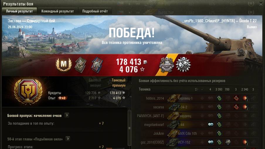 ЗАСТАВА МАСТЕР на Škoda T 27 ОПЫТ: 1294 СУММАРНЫЙ УРОН: 5733 медаль ПАСКУЧЧИ и ДОЗОРНЫЙ