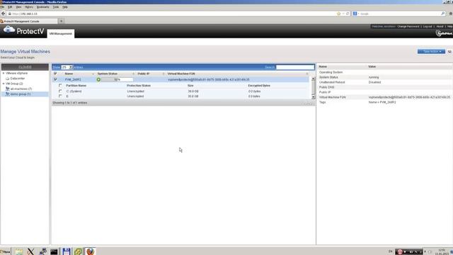 На демонстрации представлен стенд состоящий из двух узлов PVM_1 и PVM_2 (на них установлен ProtectV Manager 1.0), объединенный в кластер, функционирующий в среде VMware vSphere 5.0 Хранение ключей происходит локально (без аппаратной платформы DataSecure и KeySecure) Демонстрация состоит из следующих этапов: 1. Обзор ProtectV Management Console 2. Демонстрация отказоустойчивости на примере отключения узла PVM_1 и автоматического старта хоста при отказе 3. Pre-boot authentication (только пользователь с правами Boot to OS может запустить виртуальную машину - это уменьшает риск несанкционированного доступа административными пользователями VMware) 4. Шифрование разделов с помощью алгоритма AES 256 (system раздела и payload раздела)