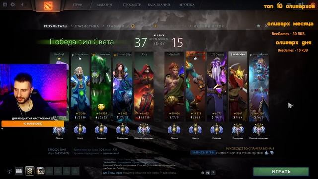 Всем привет ..меня зовут Саня и я рад вас приветствовать на Белорусском стриме ! Играю в доту со времен динозавров и за это время добился результата в 5 к ммр. ДА-ДА-ДА..знаю..скилл и рейтинг оставляет желать лучшего . Но это значит..что нас ждут самые сочные и веселые катки прямиком со дна доты. Ведь только на этих рейтингах можно встретить злых школьников и ЧСВешных мужиков. )) ____________________________________________ мой пк: процессор: AMD Ryzen 5 3600 6-core Processor озу: 8гб (2666) видеокарта : GeForse GTX 1650 SUPER (4 гб) мать: gigabyte b550m h ____________________________________________ поддержка молодого стримера : донаты от 1 рубля. песни и клипы на экран стримера 10 р. так что у всех есть шансы заставить "пердак" стримера сиять ( гореть) из-за топ донатов ;)) https://www.donationalerts.com/r/sanmirman ________________________________________ по всем вопросам пишите в инсту https://www.instagram.com/sanmirman _________________________________________ #дота #dota #stream