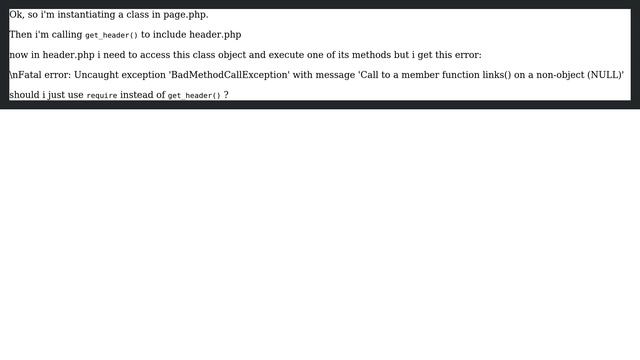 Wordpress: variable created in page.php is null inside of header.php Helpful? Please support me on Patreon: https://www.patreon.com/roelvandepaar With thanks & praise to God, and with thanks to the many people who have made this project possible! | Content (except music & images) licensed under CC BY-SA https://meta.stackexchange.com/help/licensing | Music: https://www.bensound.com/licensing | Images: https://stocksnap.io/license & others | With thanks to user r3wt (wordpress.stackexchange.com/users/66147), user Nicolai (wordpress.stackexchange.com/users/22534), and the Stack Exchange Network (wordpress.stackexchange.com/questions/175201). Trademarks are property of their respective owners. Disclaimer: All information is provided "AS IS" without warranty of any kind. You are responsible for your own actions. Please contact me if anything is amiss at Roel D.OT VandePaar A.T gmail.com
