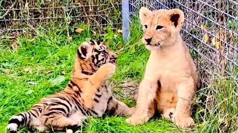Я в вольере наблюдаю за ЛЬВЕНКОМ и ТИГРЕНКОМ, сразу видна разница, тигренок НАПАДАЕТ, а львенок нет!