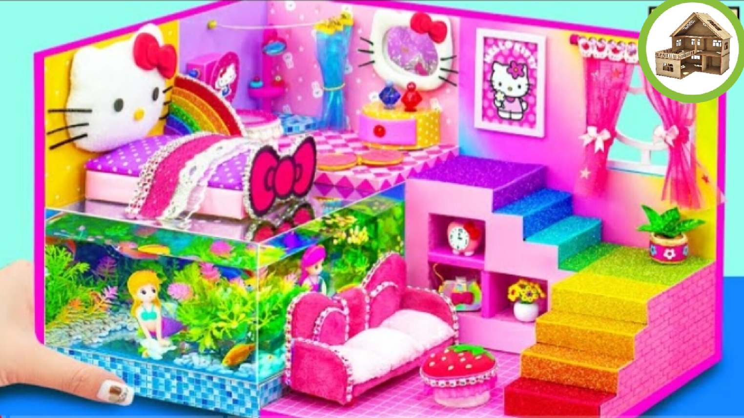 Миниатюрный цветной домик hello kitty с двумя комнатами и аквариум с русалкой из картона /132