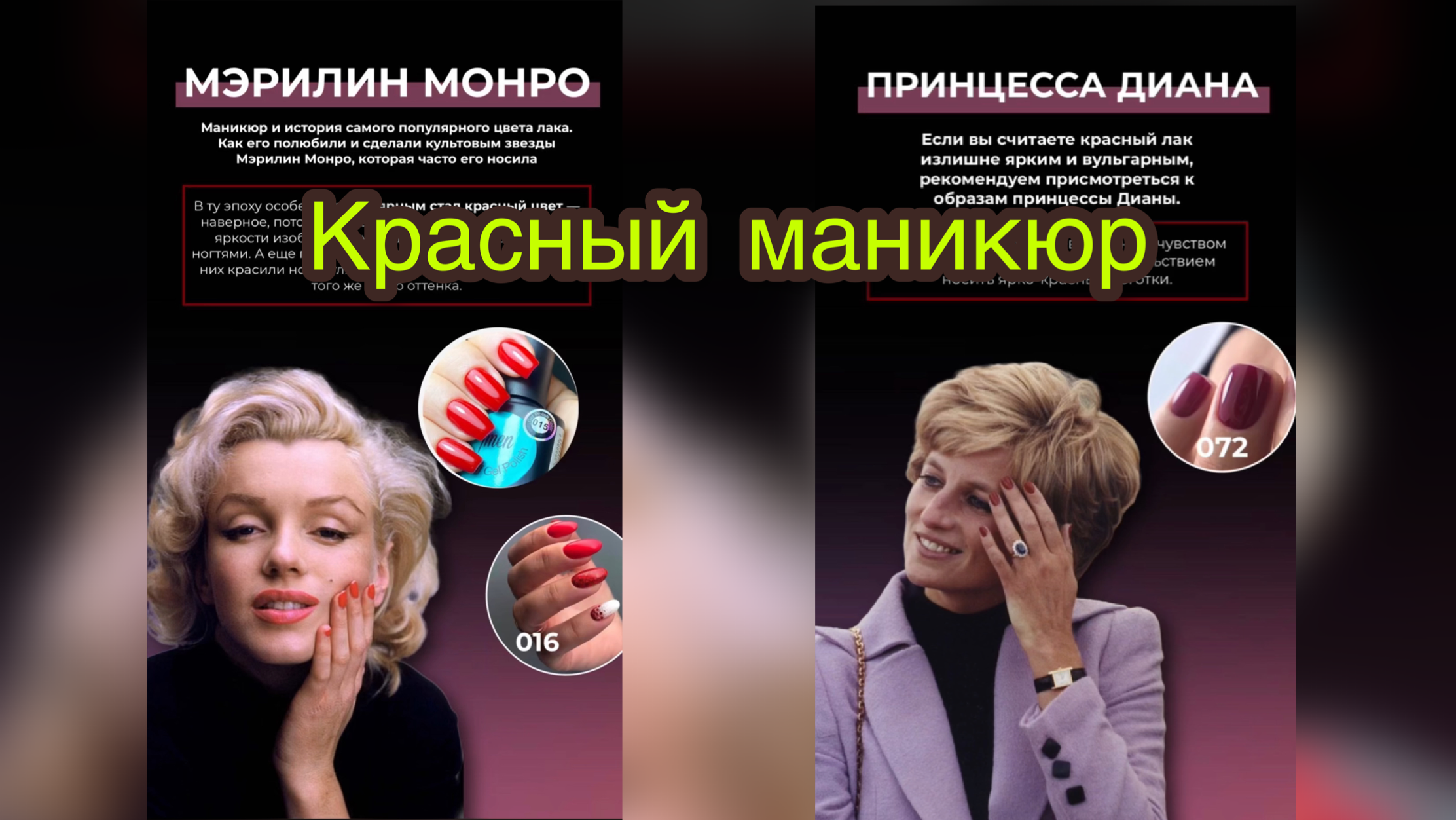 Давайте с вами сегодня посмотрим какие популярные женщины носили красный маникюр ПОЕХАЛИ❓ МЭРИЛИН МОНРО Маникюр и история самого популярного цвета лака. Как его полюбили и сделали культовым звезды Мэрилин Монро, которая часто его носила. В ту эпоху особенно популярным стал красный цвет — наверное, потому что первые рекламные постеры для яркости изображали женщин именно с красными ногтями. А еще потому, что незадолго до этого многие из них красили ногти глянцевой автомобильной краской того же алого оттенка. IMEN 016 https://www.wildberries.ru/catalog/15765926/detail.aspx?targetUrl=MS&size=45497506 СОФИ ЛОРЕН С каждым годом цветовая гамма лаков расширялась, изменялись и совершенствовались формулы. Появились технологии наращивания ногтей и шеллак (предок современного гель-лака). А классический красный маникюр продолжал покорять и удивлять. IMEN 060 https://www.wildberries.ru/catalog/15765941/detail.aspx?targetUrl=MS&size=45497521 ДИТА ФОН ТИЗ предпочитает заостренные ногти. Звезда бурлеска в восторге от насыщенных тонов красного лака и лунного маникюра. IMEN 077 https://imennails.ru/product/gel-lak-imen-077/ IMEN 115 https://www.wildberries.ru/catalog/18690635/detail.aspx?targetUrl=MS&size=50482129 ПРИНЦЕССА ДИАНА Если вы считаете красный лак излишне ярким и вульгарным, рекомендуем присмотреться к образам принцессы Дианы. Леди Ди славилась превосходным чувством стиля, что не мешало ей с удовольствием носить ярко-красные ноготки. IMEN 072 https://www.wildberries.ru/catalog/18690606/detail.aspx?targetUrl=MS&size=50482100 Оттенков красного цвета ну очень много: от светлых, стремящихся к розовым И оранжевым тонам, до очень темных и насыщенных типа бордо и бургунди. От этого напрямую зависит и их сочетаемость. С какими цветами сочетается красный цвет ногтей? Если вы гарантированно хотите удержаться в рамках хорошего вкуса, лучше отдать предпочтение альянсу красного с белым, черным и серым. В данном случае оттенок основного цвета особого значения не имеет: все равно сочетание будет безупречным. А какие цвета сочитаете Вы? Онлайн магазин www.imennails.ru https://imennails.ru/