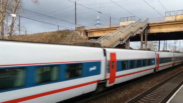 Электровоз ЭП20-007 вместе со скоростным пассажирским поездом "Стриж" пролетают станцию "о.п.435км"