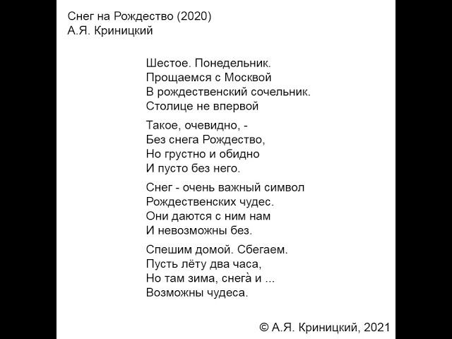 06.01.2021 6 января православные христиане отмечают Навечерие Рождества Христова или Рождественский Сочельник. Стремятся как можно скорее завершить последние приготовления. Соблюсти все строгие обычаи и предписания. Посетить церковь. Попасть к вечеру домой, чтобы встретить праздник в кругу родных и близких. Когда в этот день вдруг нарушается традиция и заведенный порядок вещей, то возникает щемящее чувство потери чего-то очень важного и значимого. Именно такое чувство, какое охватило меня год назад, 6 января 2020 года, в красиво украшенной к празднику, но абсолютно бесснежной Москве. Тогда же было написано и сегодняшнее стихотворение ... СНЕГ НА РОЖДЕСТВО © А.Я. Криницкий, 2021