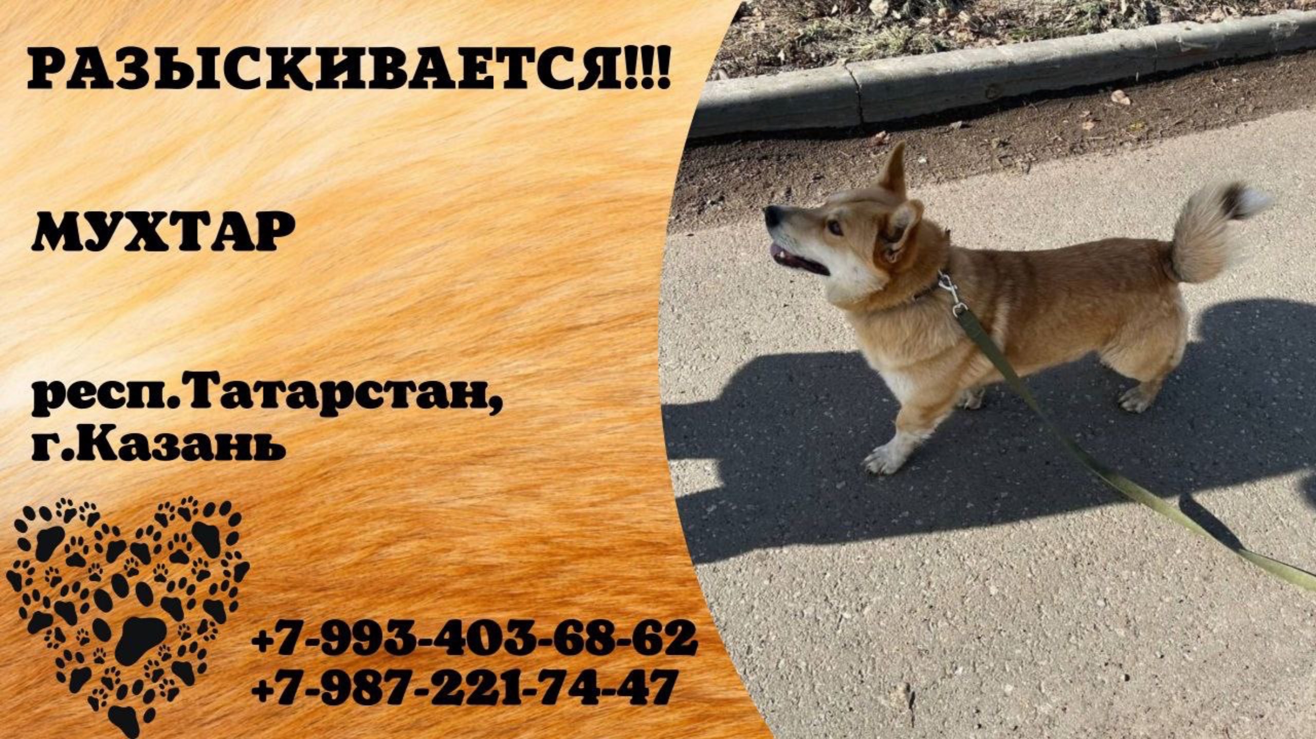 Татарстан Казань Пропала собака СРОЧНО! ПРОПАЛА СОБАКА ПОСЛЕ ОТЛОВА! Мухтар, рост ниже колена, рыже-белый окрас, белая кисточка на конце хвоста. Наша собака сбежала и попала в отлов, но снова убежала оттуда! Очень просим вашей помощи! В пятницу видели на Челюскина,а потом на квартале у Светофора Если вы увидите ее, пожалуйста, ПОЙМАЙТЕ и придержите, если есть возможность, до вторника/ среды. Если нет, то хотя бы до завтрашней ночи. Мы очень переживаем и хотим вернуть ее домой! мальчик, до отлова был не кастрирован (сейчас не знаю). очень дружелюбный Контактный телефон: +79934036862 и +79872217447 ВОЗНАГРАЖДЕНИЕ ГАРАНТИРУЕТСЯ! Пожалуйста, репост! Инфо https://vk.com/wall-198815410_172453 #пропала_собака#казань