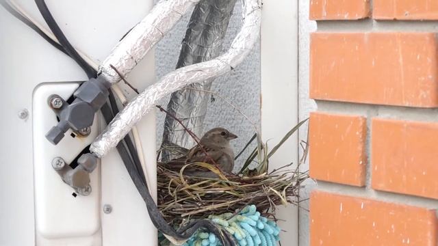 Воробьи строят гнездо