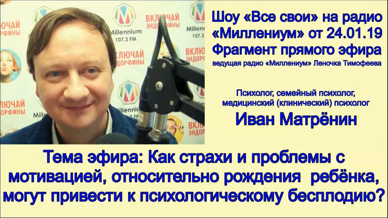 Как страхи и проблемы с мотивацией, относительно рождения ребёнка, могут привести к психологическому бесплодию? Шоу «Все свои» на радио «Миллениум» от 24.01.19. Фрагмент прямого эфира. С точки зрения психологии - психологическое бесплодие - это фактор, мешающий зачатию ребенка по причинам, не связанным с физическим состоянием потенциальной матери или отца. А что же это за такие психологические причины, не связанные с физическим состоянием потенциальной матери или отца? В этом фрагменте прямого эфира шоу "Все свои" на радио "Миллениум" от 24 января 2018 года я, психолог, семейный психолог, медицинский (клинический) психолог, Иван Матрёнин, и ведущая радио «Миллениум» Леночка Тимофеева обсуждаем страхи и проблемы с мотивацией у потенциальных родителей. Это когда, как бы хотят детей, но… Но очень уж много «Но» есть в этом для них… Подробнее, в этом видео. Приятного просмотра! Видео можно посмотреть на моём канале в YouTube - http://www.youtube.com/c/ПсихологИванМатрёнин. Ссылка на видео - https://youtu.be/uyZGJ9Lht3c Также можете смотреть видео у меня в аккаунте Instagram - https://www.instagram.com/sem.psiholog/ в IGTV! Там много текстов и видео на эту и другие темы по психологии и отношениям. Контакты: эл. почта – myvan@mail.ru. Телефон, WhatsApp, viber, telegram - +7 965 605 46 99 Вступайте, пишите! Соц. сети: Сообщество Facebook: группа - Иван Матрёнин Психология отношений – https://www.facebook.com/ivanmatreninpsi адрес в одноклассниках личный - https://ok.ru/myvan адрес вконтакте личный – Иван Матрёнин – https://vk.com/matreninivan Получить консультацию online на b17 - https://www.b17.ru/matrenin/ Мои сообщества Вконтакте: группа – «Психология семьи и отношений. Иван Матрёнин» – https://vk.com/ivan_matrenin группа – «Психология на русском языке и для наших людей» - https://vk.com/psiholog_matrenin группа – «Стройность от психолога. Блог Ивана Матрёнина» – https://vk.com/stroinost_matrenin группа – «Про гипноз и НЛП» - https://vk.com/gipnoz_matrenin