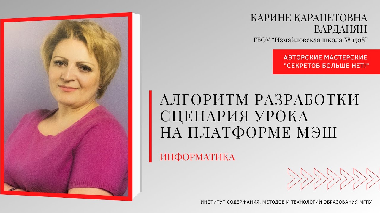 Ведущая: Варданян Карине Карапетовна, учитель информатики ГБОУ “Измайловская школа № 1508” Тема: "Алгоритм разработки сценария урока на платформе МЭШ"