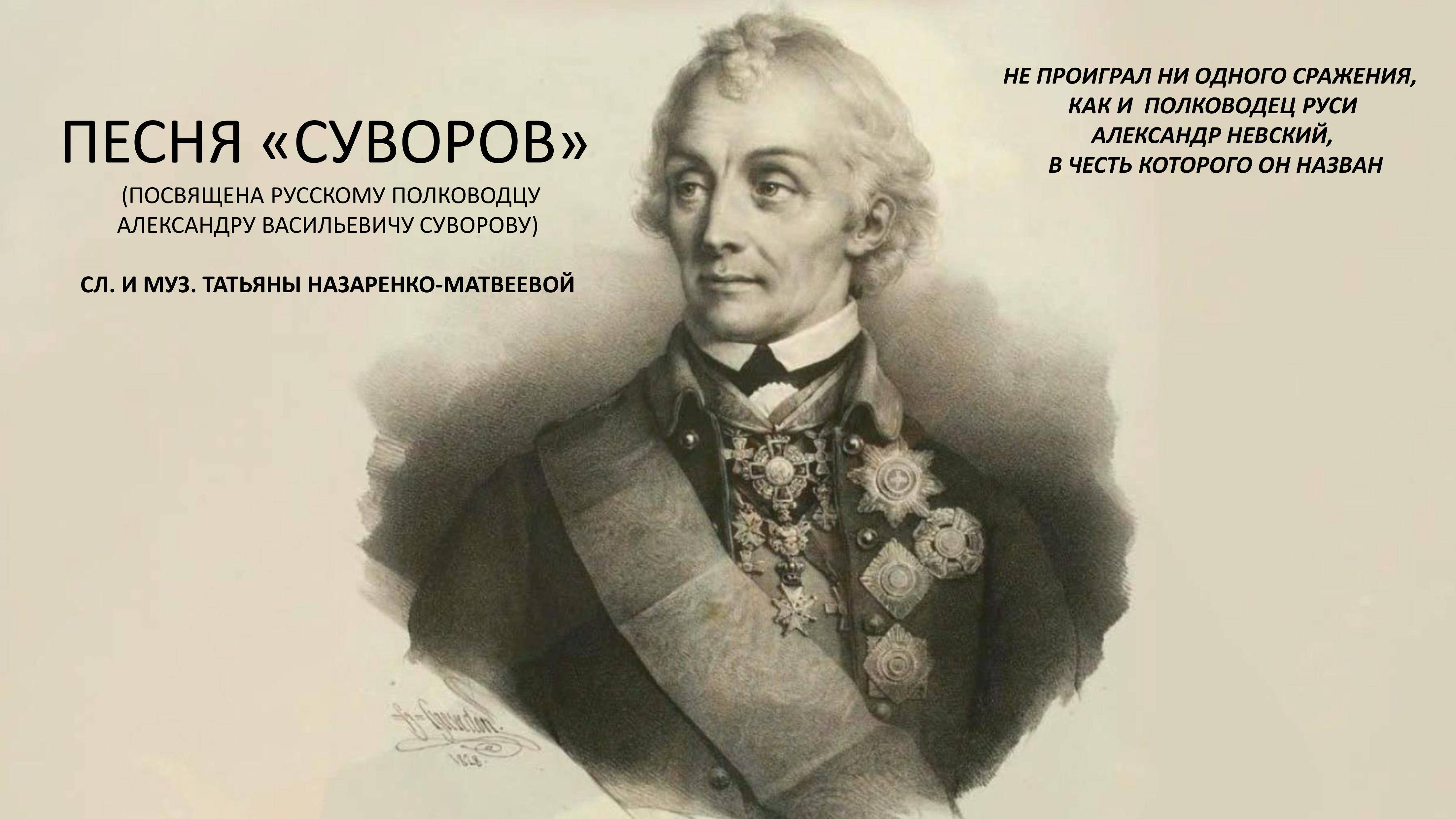 Песня посвящена Александру Васильевичу Суворову (24.11.1730 – 18.05. 1800 (69 лет) — русскому полководцу, военному теоретику, одному из основоположников русского военного искусства. А.В. Суворов известен тем, что не проиграл ни одного сражения, включая те, где силы противника значительно превосходили российскую армию по численности.