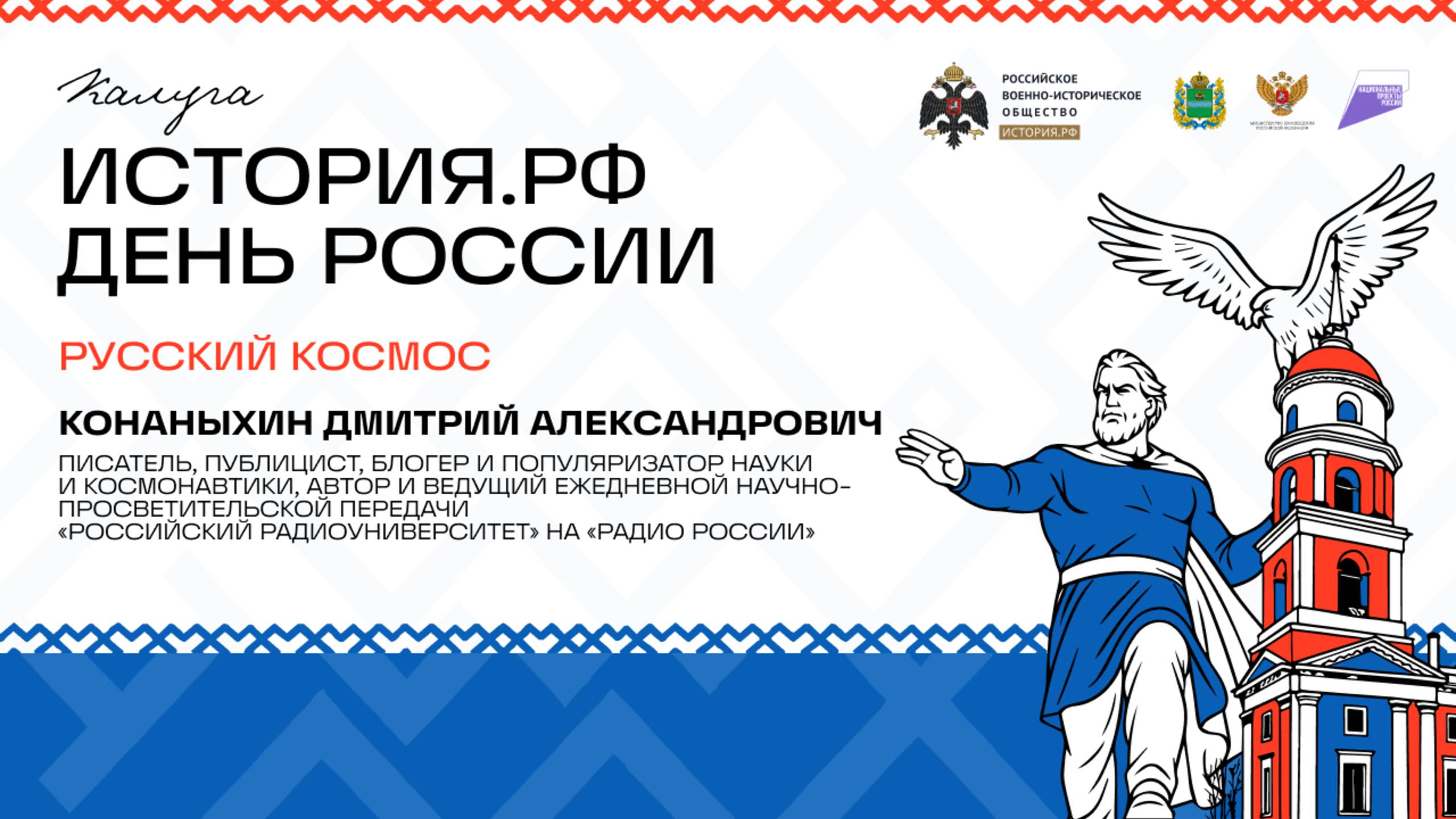 Лекция писателя, публициста, блогера и популяризатора науки и космонавтики, автора и ведущего ежедневной научно-просветительской передачи «Российский радиоуниверситет» на Радио России Дмитрия Конаныхина. С 11 по 13 июня в Калуге прошла вторая Межрегиональная конференция «Разработка государственных учебников по региональной истории». Мероприятие объединило авторские коллективы из 38 субъектов (ЦФО, СЗФО, УФО, ПФО и регионов Донбасса и Новороссии) России. Она организована в соответствие с Поручением Президента Российской Федерации по инициативе Владимир Мединского. Самое актуальное от федерального портала История.РФ в соцсетях: VK: https://vk.com/histrfvk Дзен: https://zen.yandex.ru/histrf Telegram: https://t.me/rf_history Rutube: https://home.strannik-j.org/channel/23517827/ YouTube: https://www.youtube.com/channel/UCJf5zN7YGOYF3IacL9MqJAg #история #учебникистории #историярф
