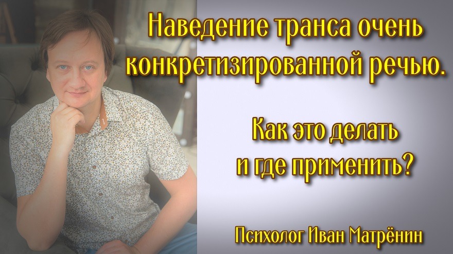 Если вы вспомните свой опыт нахождения на лекции, то возможно будет и воспоминание о том, что на некоторых лекциях вы замечали себя находящимися в трансе, а кто-то даже просто засыпал! Это, наверное, было в то время поводом для шуток, приколов в группе студентов или преподавателей. Но почему же так происходило? Дело в том, что когда человек начинает говорить очень расплывчатой речью или очень конкретной речью, это уводит в транс. Наведение транса в Эриксоновском гипнозе традиционно связывают с Милтон-модельной, очень неконкретной речью. Но в этом видео я рассказываю и о другой возможностью, о очень детальном описании, которое также может увести в транс. Подробнее, в этом видео. Приятного просмотра! Видео можно посмотреть на моём канале в YouTube - http://www.youtube.com/c/ПсихологИванМатрёнин. Ссылка на это видео в YouTube - https://youtu.be/PwzBeiGOApg Ссылка на это видео в Rutube - https://home.strannik-j.org/video/c917f76667e9ac37c6bbd49e12e41ebe/ Также можете смотреть видео у меня в аккаунте Instagram - https://www.instagram.com/sem.psiholog/ в IGTV! Там много текстов и видео на эту и другие темы по психологии и отношениям. Контакты: эл. почта – myvan@mail.ru. Телефон, WhatsApp, viber, telegram - +7 965 605 46 99 Вступайте, пишите! Соц. сети: Сообщество Facebook: группа - Иван Матрёнин Психология отношений – https://www.facebook.com/ivanmatreninpsi адрес в одноклассниках личный - https://ok.ru/myvan адрес вконтакте личный – Иван Матрёнин – https://vk.com/matreninivan Получить консультацию online на b17 - https://www.b17.ru/matrenin/ Мои сообщества Вконтакте: группа – «Психология семьи и отношений. Иван Матрёнин» – https://vk.com/ivan_matrenin группа – «Психология на русском языке и для наших людей» - https://vk.com/psiholog_matrenin группа – «Стройность от психолога. Блог Ивана Матрёнина» – https://vk.com/stroinost_matrenin группа – «Про гипноз и НЛП» - https://vk.com/gipnoz_matrenin