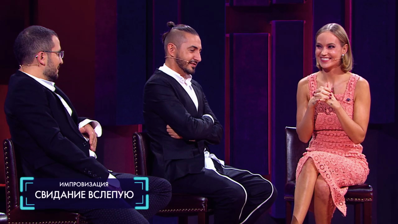 Импровизация «свидание в слепую». Глюк'oZa пытается понять, кто перед ней находится. А ребята стараются себя вести, как снеговик, который вот-вот растает, как снегурочка, которая поменяла свой пол и Дедушка Мороз с Кавказа.