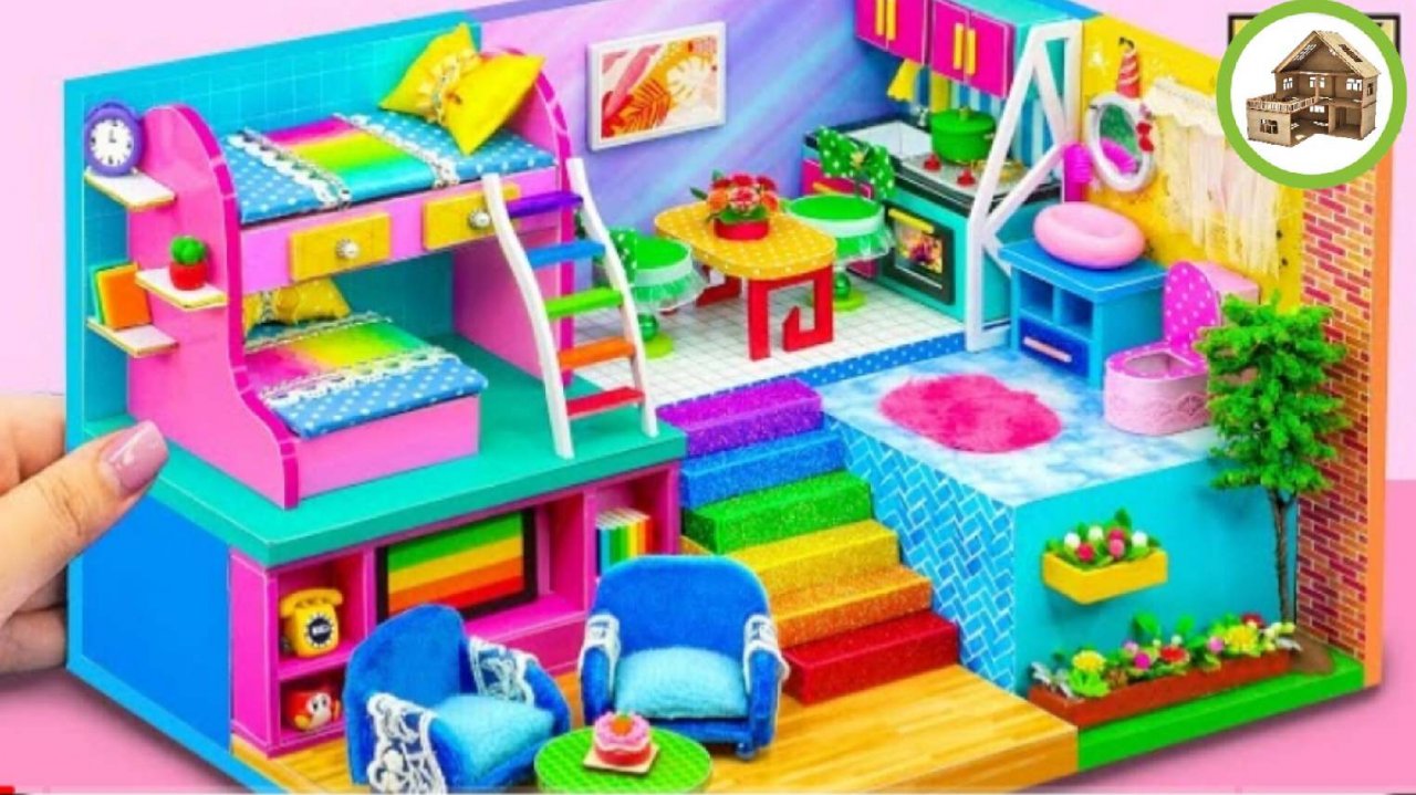 Миниатюрный облычный домик с 4 комнатами и двухъярусной кроватью для семьи из картона /135