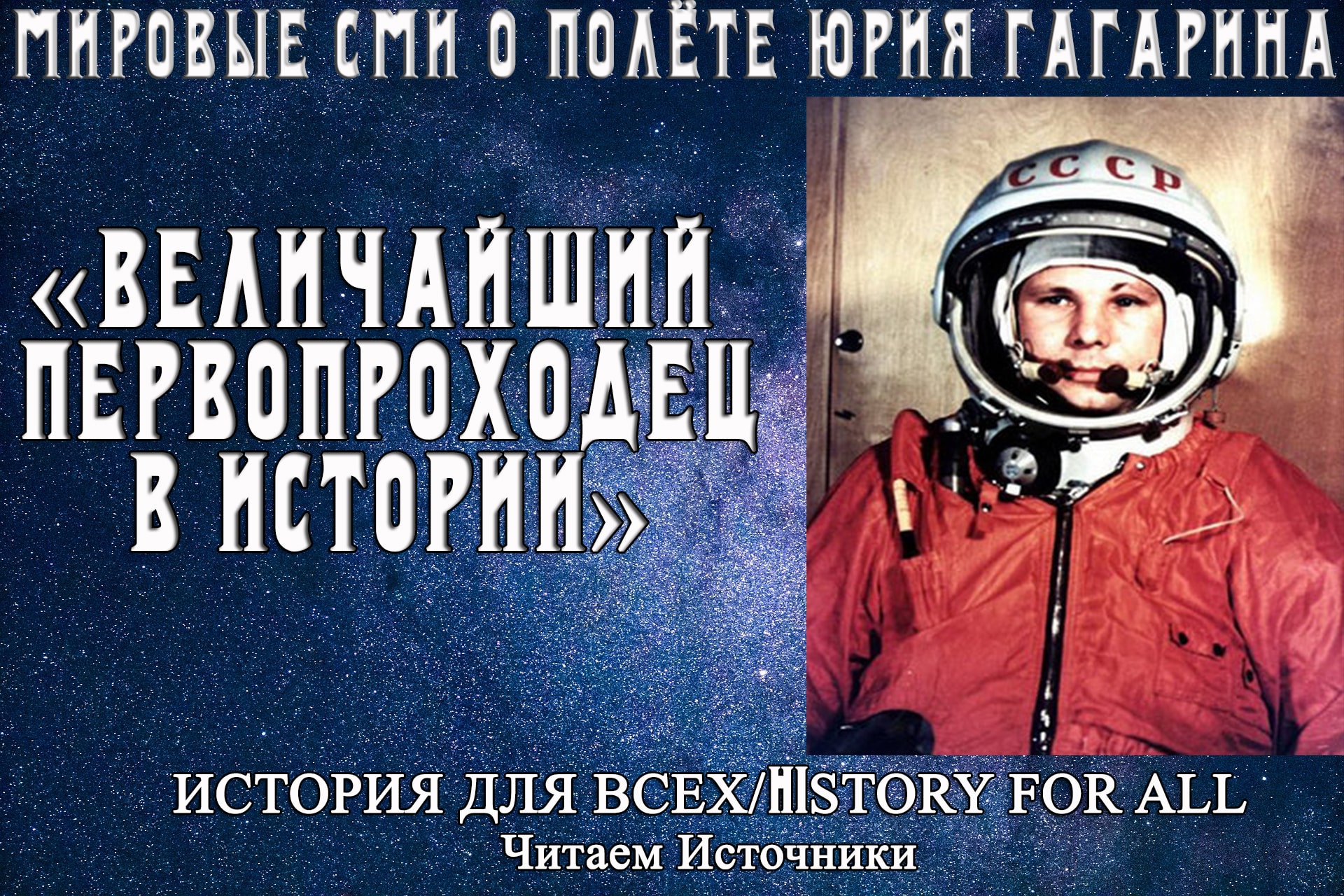 12 апреля мы отмечаем 61-ю годовщину величайшего события – первого полёта человека в космос. 12 апреля 1961 года космонавт Юрий Алексеевич Гагарин на корабле «Восток» вышел в космос и совершил один оборот вокруг Земли. С малых лет каждый житель нашей страны и всей планеты знает о полёте Гагарина. Любые слова о значимости этого дня для СССР и всего человечества кажутся банальными. В этом видео мы предоставим слово мировым новостным изданиям, прокомментировавшим полёт первого человека в космос. Данный ролик канала "ИсторияДляВсех" впервые вышел 10.04.2021 на ютубе: youtu.be/DuTY5LgN4Fo Youtube: www.youtube.com/...рияДляВсех Rutube: home.strannik-j.org/.../25421960/ Telegram: t.me/IstoriyaDV ТикТок: www.tiktok.com/...adlyavsekh Автор канала на сайте ВКонтакте: vk.com/id33616984 ЖЖ: igor-gaivor91.livejournal.com/profile Твиттер: mobile.twitter.com/IgorGaiv Съёмка, монтаж, сведение звука, продвижение (Олег): vk.com/qlook Помочь каналу: Карта Сбербанка: 4276 5500 1696 2881 ЮMoney: 410012978794589 #денькосмонавтики, #юрийгагарин, #первыйполётвкосмос, #поехали, #историяосвоениякосмос, #вселеннаяимы, #онсказалпоехали, #корабльвосток, #космическийкорабль, #первыйкосмонавт, #ракетоноситель, #выходнаорбита, #наукассср, #сергейкоролёв, #покорениекосмоса, #историяссср, #историясоветскогосоюза, #великиеоткрытия, #никитахрущёв, #60е, #60s, #шестидеясятые, #космонавтика, #историядлявсех, #научнопопулярныеканалы, #историческийканал, #историк