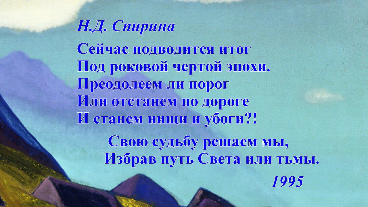 Наталия Спирина * * * Сейчас подводится итог Под роковой чертой эпохи. Преодолеем ли порог Или отстанем по дороге И станем нищи и убоги?! Свою судьбу решаем мы, Избрав путь Света или тьмы. 1995 г. Читает автор. #НаталияСпирина, #поэзияновойэпохи, #ПоэзияСпириной -------------------------------------------- О Наталии Дмитриевне Спириной: * Сайт, посвященный Н.Д. Спириной: https://spirina.info * Раздел на сайте СибРО: http://sibro.ru/teacher/spirina/ * Читать стихи: https://sibro.ru/poetry/ * Плейлист "Наталия Спирина. Стихи": https://www.youtube.com/playlist?list=PLRDwJtqWLAx6FDWLWUSyVeqmBAs0Cfx7c * Видеофильмы о Н.Д. Спириной: https://www.youtube.com/playlist?list=PLRDwJtqWLAx7zdjQRW1u5QSUW3T6SJ4rj * Вконтакте: https://vk.com/natalia.spirina * Telegram: https://t.me/SpirinaN • Рериховская поэзия: https://www.youtube.com/playlist?list=PLRDwJtqWLAx6Q4cJ_smGoz7zmaKXZee-N • Рериховская поэзия на сайте СибРО: http://sibro.ru/poetry/ -------------------------------------------- Помочь проектам СибРО: https://sibro.ru/dari-dobro/ Благодарим всех наших помощников и приглашаем к сотрудничеству! -------------------------------------------- /// Ссылки на ресурсы СибРО: Канал Сибирского Рериховского Общества и Музея Николая Рериха в Новосибирске https://www.youtube.com/c/videosibro Канал «Трансляции СибРО» https://www.youtube.com/c/telesibro ВКонтакте: «СибРО. Трансляции»: https://vk.com/telesibro Сайт СибРО: https://sibro.ru Сайт наследия Н.Д.Спириной: https://spirina.info Вконтакте: https://vk.com/roerichmuseumnsk Однокласники: https://ok.ru/roerichmuseum Telegram: https://t.me/RoerichN Дзен: https://dzen.ru/roerichmuseum Rutube: https://home.strannik-j.org/channel/24606905/ Интернет-магазин "Искры Света": https://knigisibro.ru или на Ozon: https://www.ozon.ru/publisher/rossaziya-5101720/ Книги издательства СибРО "РОССАЗИЯ": https://rossasia.sibro.ru/knigi/